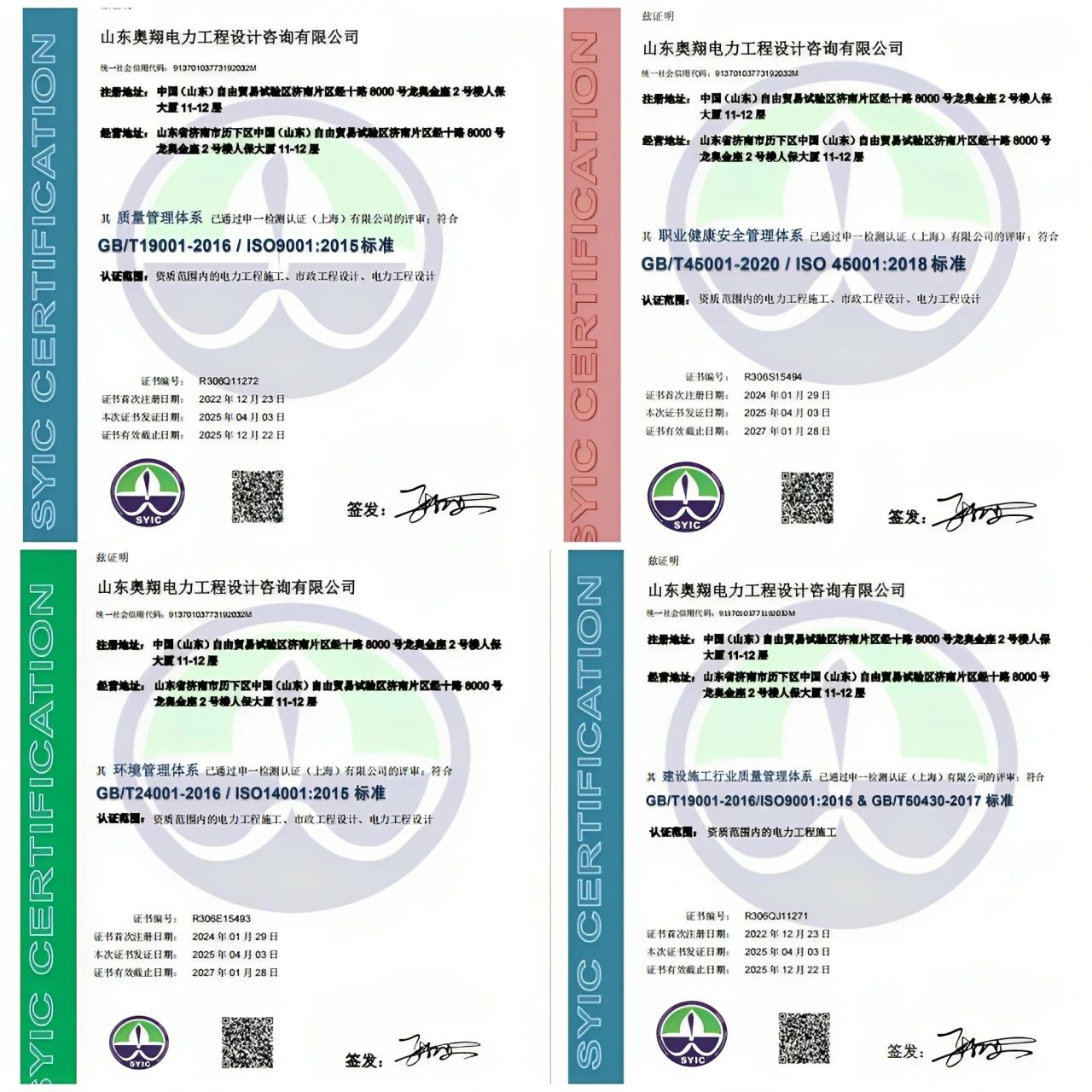 山東奧翔電力工程設計咨詢有限公司順利通過ISO三體系及GB/T 50430認證