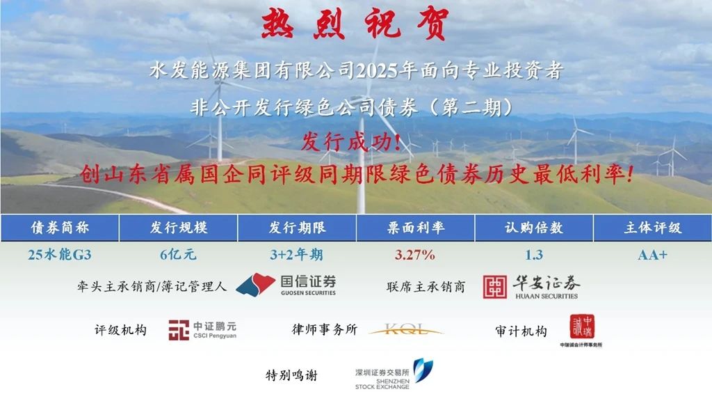 捷報(bào)!水發(fā)能源集團(tuán)成功發(fā)行六億綠色公司債券 創(chuàng)山東省屬?lài)?guó)企同評(píng)級(jí)同期限綠色債券歷史最低利率